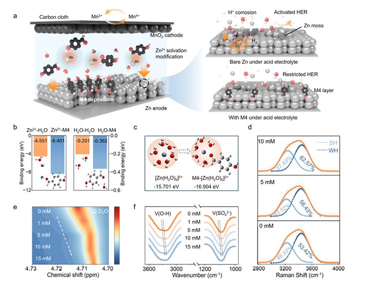 - (c) Compares the Zn²⁺ solvation structure before and after adding M4, confirming that M4 successfully replaces water molecules and reconstructs the solvation shell;