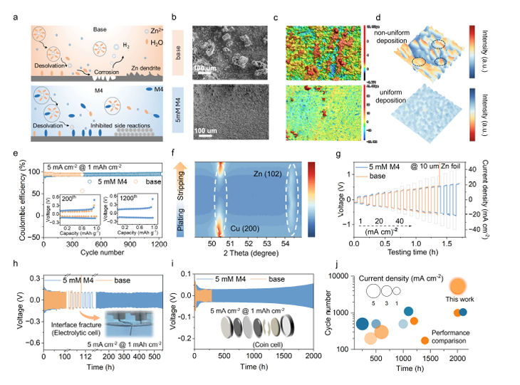 - (h)(i) The Zn symmetric battery in the M4 electrolyte has a cycle stability of over 2000 hours (5 mA cm⁻², 1 mAh cm⁻²), which is 5 times the lifespan of batteries with traditional electrolytes;