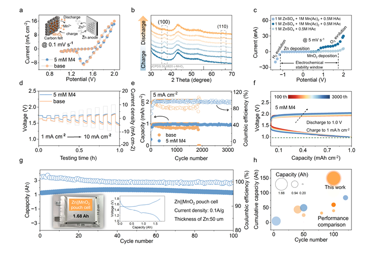 - (e) The Zn//MnO₂ coin battery in the M4 electrolyte achieves stable cycling for over 3000 times, with an average Coulombic efficiency of 97.3%;